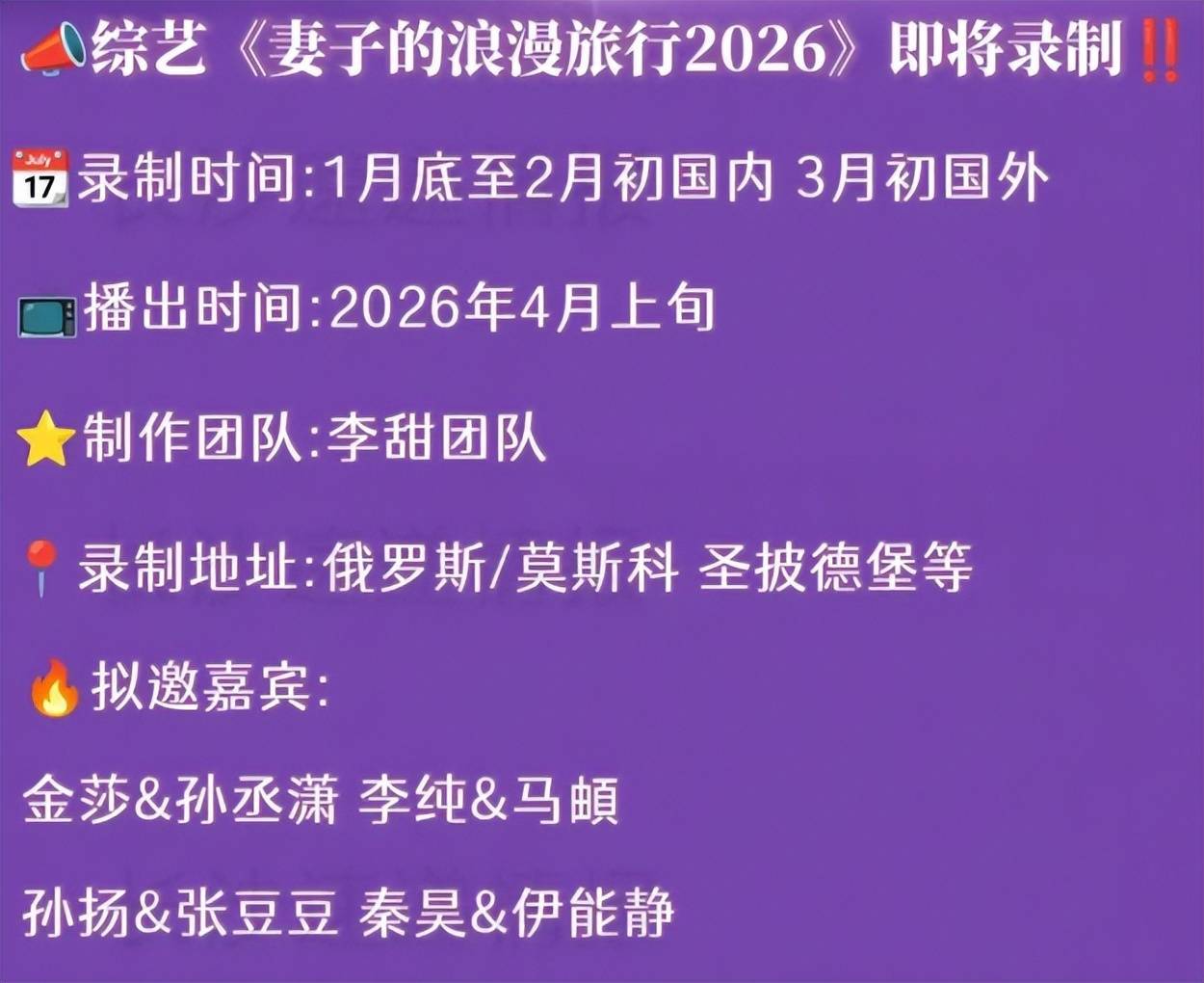 芒果台这回真是不按套路出牌,消失许久的《妻子的浪漫旅行》2026新一季终于要录了辽宁股票配资公司,这回网传还要跑去俄罗斯。